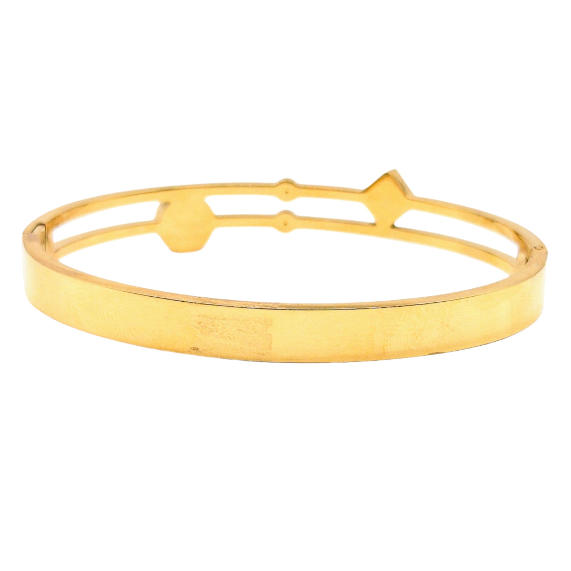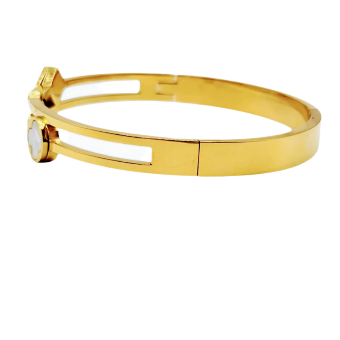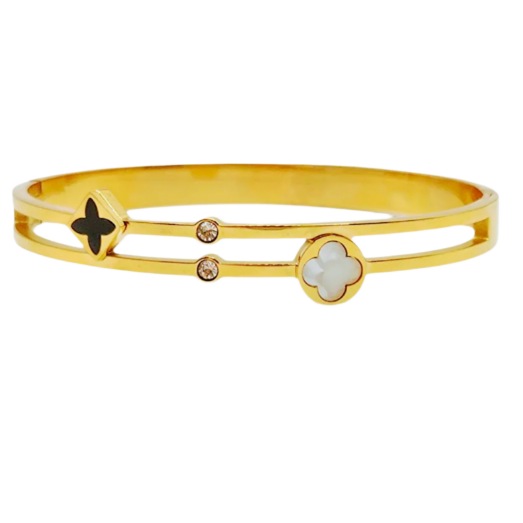 Bangle styled bracelet with mother of pearl and crystals in yellow plating