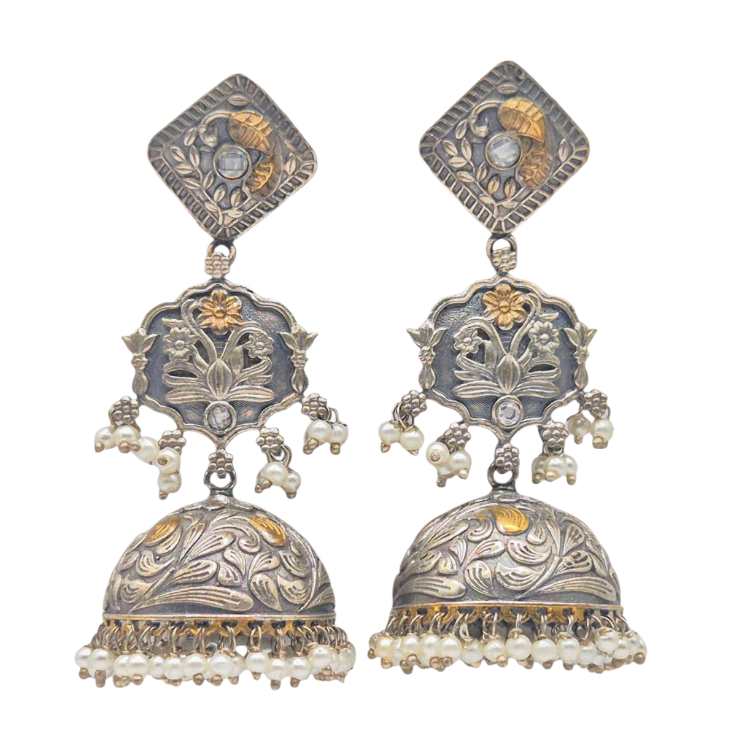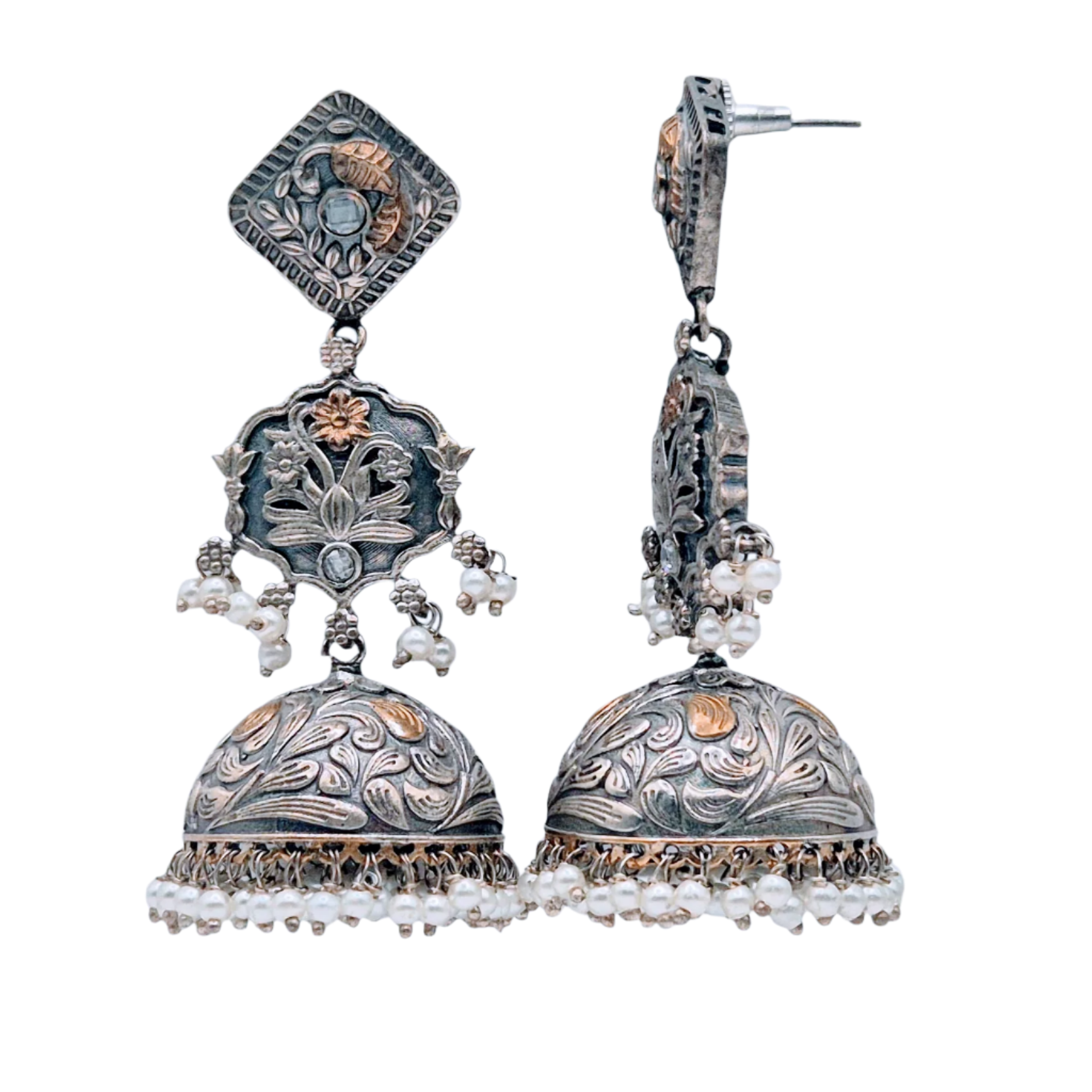 Dual tone ethnic german silver earrings with white quartz