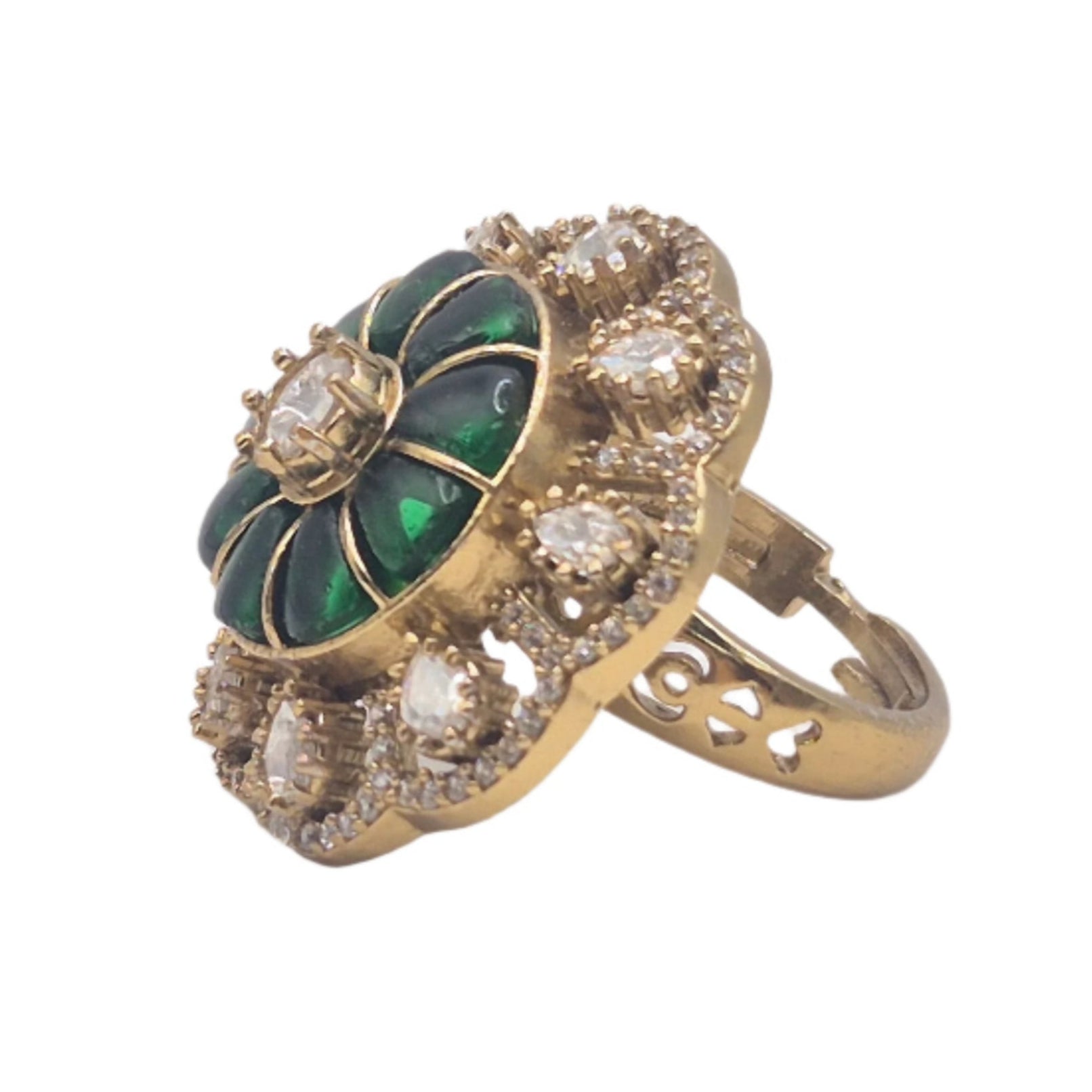 Green semi precious stones with Moissanites in an adjustable brass ring
