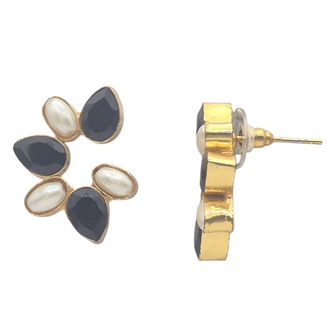 Black Quartz and Pearls in a designer shape of eartops, in brass with plating