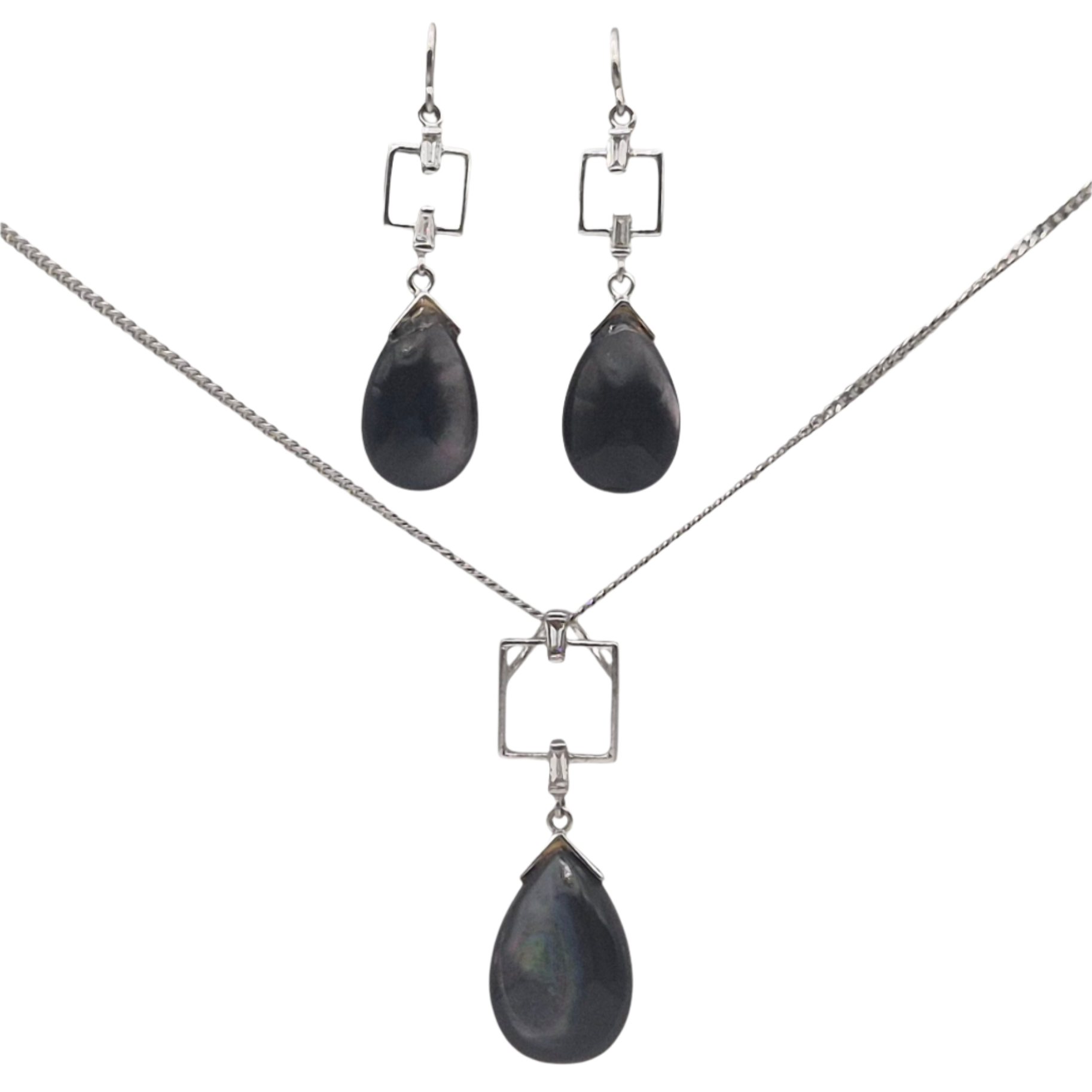 Mother of Pearl and Natural Baguette Diamonds in 18kt White Gold , a set of earrings and pendant