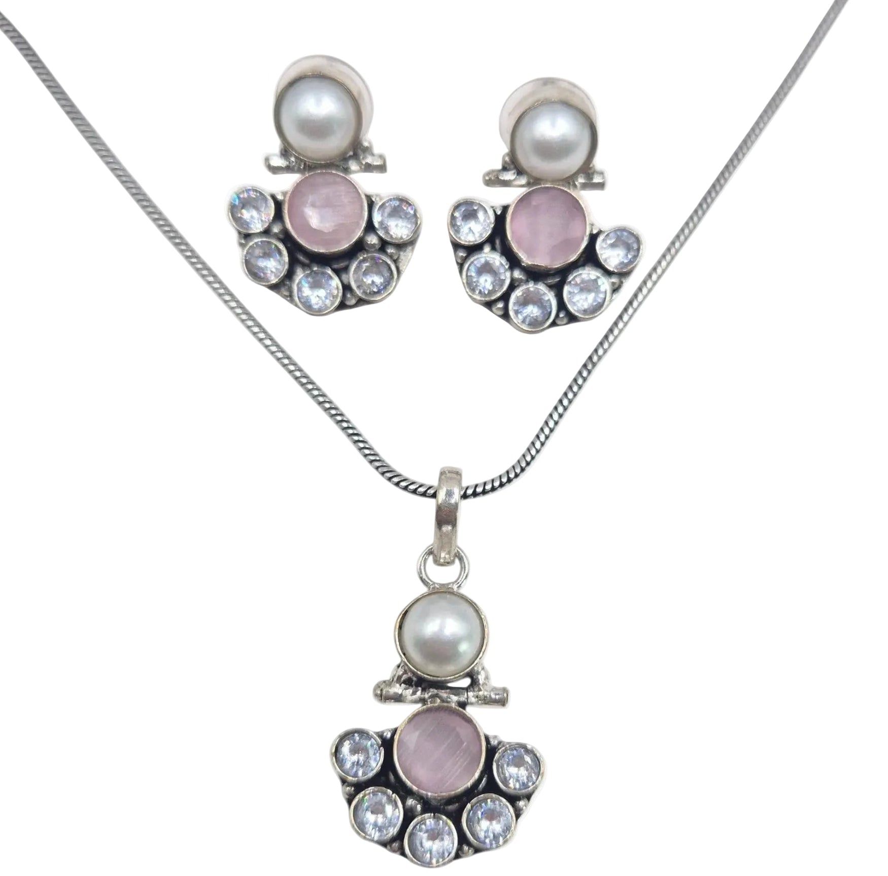 Pastel Pink and Round Zircon and White Pearl Set in brass